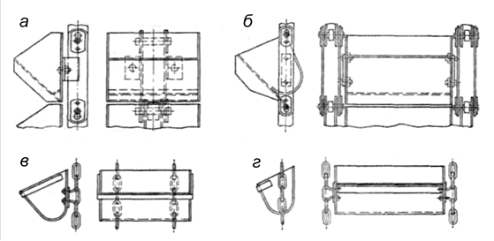 Рис. 15.4. Типы крепления ковшей к цепям: а – к пластинчатой цепи задней стенкой; б – к пластинчатой цепи боковыми стенками; в – к сварной цепи задней стенкой; г – к сварной цепи боковыми стенками