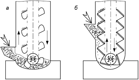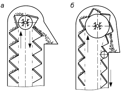 Рис. 15.5. Способы заполнения ковшей элеватора: а – зачерпыванием из нижней части кожуха; б – засыпанием в ковши