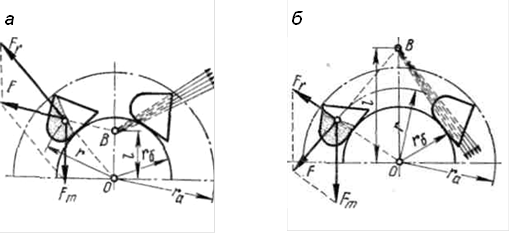 Рис. 15.6. Схемы разгрузки ковшей: а – центробежная; б – самотечная: В – полюс; / – полюсное расстояние; r, rа, rб – расстояние от центра барабана (звездочки) соответственно до центра тяжести груза в ковше, до наружной кромки ковша, до внутренней стенки ковша; Fm и Fr – соответственно сила тяжести и центробежная сила массы груза в ковше; F – равнодействующая сил Fm и Fr