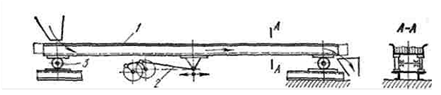 Рис. 18.2. Инерционный конвейер с постоянным давлением груза на дно желоба: 1 – желоб; 2 – двухкривошипный привод; 3 – опорный каток