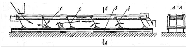 на дно желоба: 1 – желоб; 2 – кривошипный привод; 3 – рама; 4 – стойка