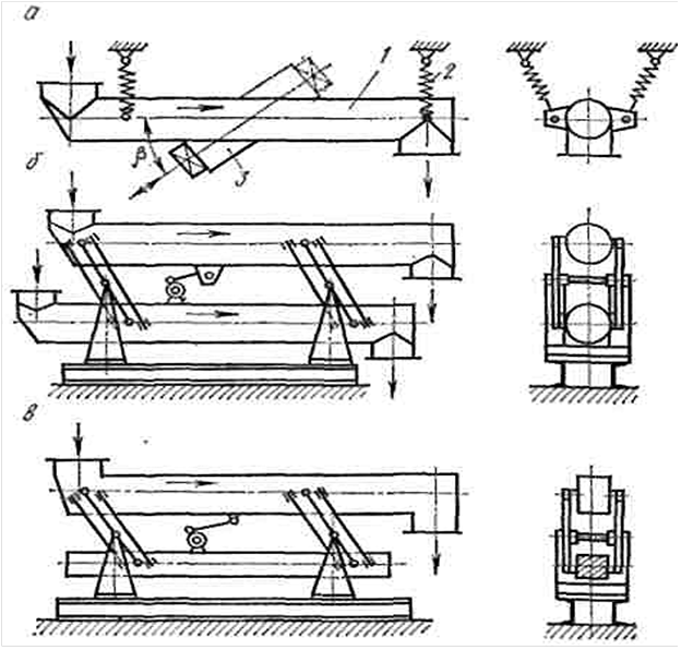 Рис. 18.4. Схемы вибрационных конвейеров: а – однотрубный на пружинных подвесках с электровибратором; б – двухтрубный на упругих стойках с эксцентриковым вибратором; в – однотрубный на упругих стойках с эксцентриковым вибратором и уравновешивающей балкой: 1 – грузонесущий элемент; 2 – амортизатор; 3 – вибратор