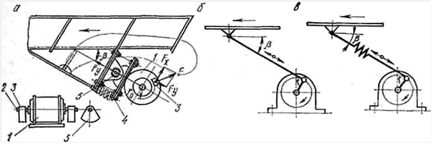 Конвейер с переменным давлением груза (рис. 18.3) состоит из желоба 1, упругих стоек 4, жестко прикрепленных к желобу и опорной раме под углом β к вертикали, рамы 3 и кривошипного привода 2. При такой схеме конвейера давление груза на желоб при прямом и обратном ходе различно.