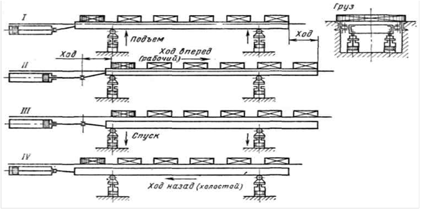 I – подъем, II – рабочий ход перемещения, III – опускание и IV – холостой (обратный) ход. В результате подвижная рама в конце цикла возвращается в исходное положение. Движение грузов на конвейере происходит во время рабочего хода подвижной рамы.