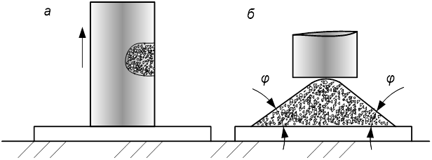 Для определения этого угла груз насыпается в цилиндр, не имеющий дна и крышки, который установлен на горизонтальной плоскости (рис. 2.2, а). Затем цилиндр медленно поднимается вверх. Так образуется конус из свободно насыпанного груза (рис. 2.2, б).