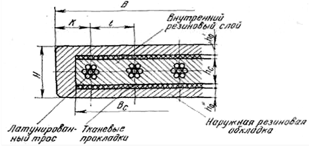 Рис. 4.15 Резинотросовая лента: B – ширина ленты, мм; K – расстояние