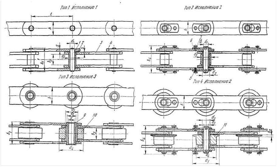 Существует деление пластинчатых цепей на типы и исполнения (рис. 4.4).