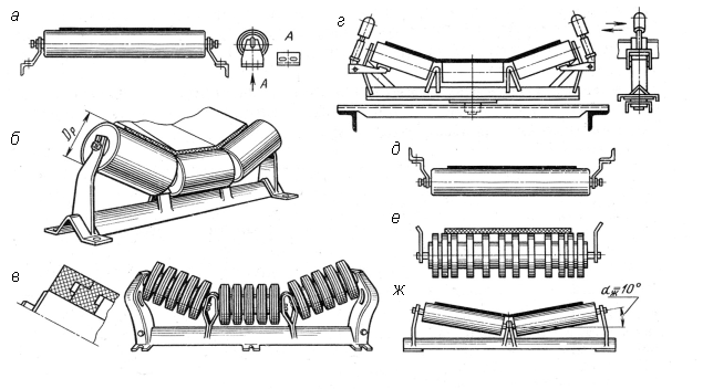 Рис. 5.1. Роликоопоры: а, б, в, г – для верхней ветви конвейера соответственно рядовая прямая, рядовая желобчатая, амортизирующая, центрирующая; д, е, ж – для нижней ветви соответственно рядовая прямая, дисковая очистная, рядовая желобчатая