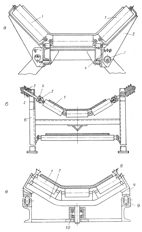 Рис. 5.2. Конструкции трехроликовых роликоопор: а – универсальная жесткая; б – подвесная шарнирная; в – центрирующая;