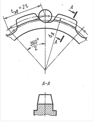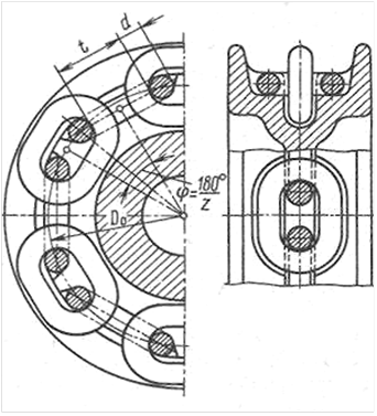 Профиль зуба блока-звездочки для калиброванной круглозвенной цепи показан на рис. 6.2. Звездочка имеет зубья и плоские ячейки для размещения горизонтальных звеньев цепи. Плоские основания ячеек исключают возможность изгиба звеньев при огибании блока-звездочки и уменьшают его диаметр. Для приводных звездочек обычно принимают количество ячеек (зубьев) z = 16…24. Диаметр делительной окружности, мм,
