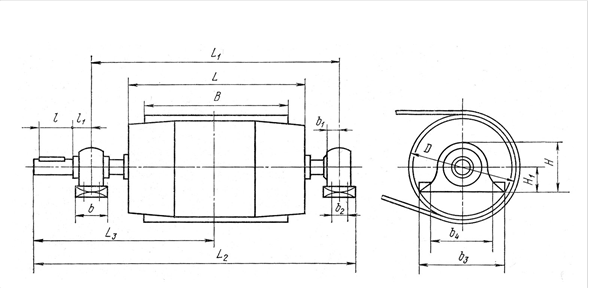 Основные параметры приводных барабанов ленточных конвейеров приведены на рис. 6.6 и в табл. 6.1, концевых, оборотных и отклоняющих барабанов – на рис. 6.7 и в табл. 6.2.