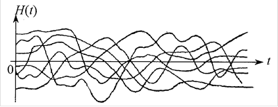 Представим себе теперь, что рассматривается случайная функция  не для одной высоты Н, а для целого диапазона, внутри которого задан какой-то закон распределения высот (например, закон равномерной плотности). Такая случайная функция, оставаясь стационарной, очевидно, уже не будет обладать эргодическим свойством; ее возможные реализации, осуществляющиеся с какими-то вероятностями имеют различный характер (рис. 6.8).