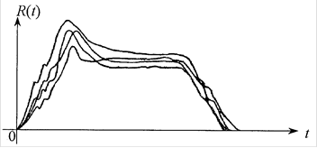 На рис. 6.2 изображено семейство реализаций явно нестационарного случайного процесса – процесса изменения тяги двигателя реактивного снаряда во времени.
