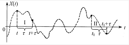 Установим, какому условию должна удовлетворять корреляционная функция стационарной случайной функции. Рассмотрим случайную функцию  (рис. 6.3). Положим в выражении   и рассмотрим  – корреляционный момент двух сечений случайной функции, разделенных интервалом времени . Очевидно, если случайный процесс X(t) действительно стационарен, то этот корреляционный момент не должен зависеть от того, где именно на оси Оt мы взяли участок , а должен зависеть только от длины этого участка. Например, для участков I и II на рис. 6.3, имеющих одну и ту же длину , значения корреляционной функции и  должны быть одинаковыми.