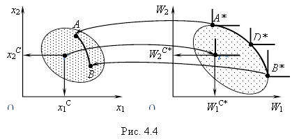 Условия (4.13) определяют множество допустимых решений и образуют на плоскости х1Ох2 некоторую область, каждой точке С которой соответствует точка С* в пространстве значений критериев W1OW2 (Рис. 4.4). Ее координаты  вычисляются по формулам (4.12) при  х1 = х1Сх2 = х2С: