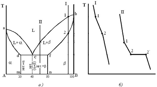 Рис. 5.5 Диаграмма состояния сплавов с ограниченной растворимостью компонентов в твердом состоянии (а) и кривые охлаждения типичных сплавов (б)