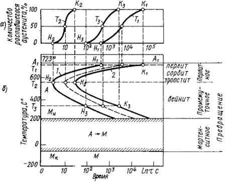 Рис. 12.5. Кинетические кривые превращения аустенита при охлаждении (а); диаграмма изотермического превращения аустенита (б)