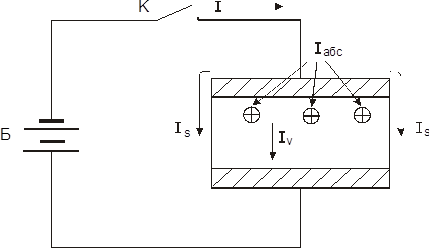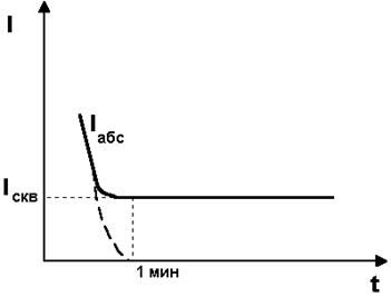 Другой характерной особенностью электропроводности диэлектриков является постепенное спадание тока со временем (рис. 2.2), после включения постоянного напряжения (замыкания контакта К на рис. 2.1). С течением времени ток достигает некоторой постоянной величины, называемой током сквозной проводимости (Iскв). Величина Iскв определяется наличием в диэлектрике свободных носителей заряда. Спадающая часть тока называется током абсорбции Iабс (рис. 2.1 и 2.2), обусловленным наличием в диэлектрике замедленных видов поляризации.