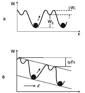 Рис. 2.3. Модель ионной проводимости твердых диэлектриков: а – без внешнего поля; б – понижение потенциального барьера W0 на величину qex при наложении электрического поля напряженностью e (W1 – глубина междоузельной потенциальной ямы)