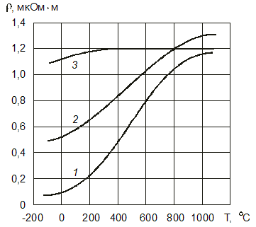 Рис. 3.14. Зависимость удельного сопротивления металлов и сплавов от температуры: 1 – железо; 2 – электротехническая сталь с содержанием 4 % Si; 3 – сплав Fe-Ni-Cr