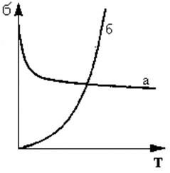 Рис. 4.1. Зависимость удельной проводимости от температуры для металлов (а) и полупроводников (б)