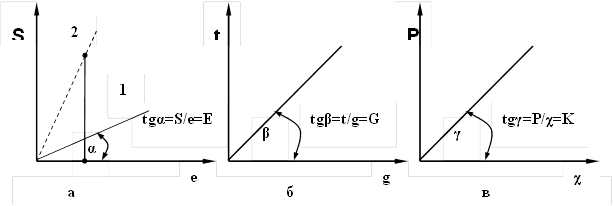 Поведение металлов при упругой деформации описывается законом Гука, который определяет прямую пропорциональность между напряжением и упругой деформацией. На рисунке 4 показаны начальные (упругие) участки кривых напряжение – деформация при одноосном растяжении, кручении и гидростатическом сжатии.
