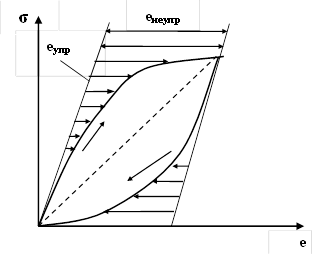 Неупругие эффекты служат причинами внутреннего трения, характеризующего необратимые потери энергии внутри металла. Линии диаграммы напряжение – деформация при нагрузке и разгрузке из-за неполной упругости металлов не совпадают (рисунок 7), а образуют петлю гистерезиса. Ее площадь и характеризует энергию, рассеянную за один цикл нагружения.