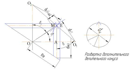 При качении без скольжения плоскости по основному конусу точки прямой, например OE, опишут коническую эвольвентную поверхность зуба. Точка Е опишет эвольвенту на поверхности шара R = Re. На практике сферическую поверхность заменяют касательной конической, образующие которой нормальны к делительному конусу О1М ^ОМ. Эту поверхность называют дополнительным делительным конусом.