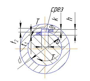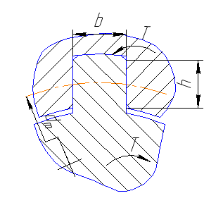 Шпонки стандартизованы, приводятся для каждого d: b, h, t1, t2 и l.