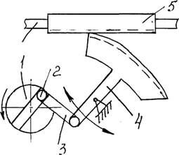 От вращения кривошипного диска 1 с радиально подвижным пальцем 2 движение через раздвижной шатун 3, качающийся рычаг 4 с зубчатым сектором передается круглой рейке 5, закрепленной на шпинделе 6. За счет радиального перемещения пальца 2 можно регулировать ход шпинделя 6, а за счет изменения длины шатуна 3 - крайние положения инструмента, закрепленного в шпинделе.