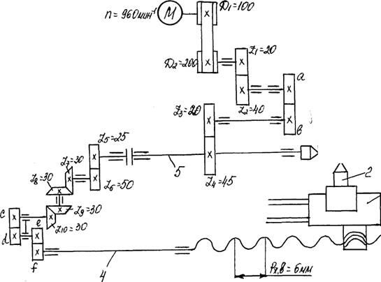 Определим колеса а и b и тем самым произведем наладку цепи главного движения. Затем приступим к наладке кинематической цепи движения подачи или цепи нарезания резьбы. Резец 2, укрепленный на суппорте 3, получает движение от ходового винта 4, который приводится во вращение от шпинделя 5 через пару цилиндрических колес, две пары конических колес и сменные зубчатые колеса с – d и е-f.