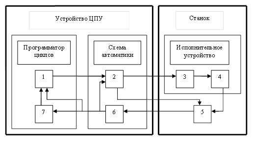 Программатор циклов состоит из блока задания программы 1 и блока поэтапного ввода программы 7. Из блока задания программы 1 информация поступает в схему автоматики, состоящую из схемы управления циклом работы станка 2 и схемы преобразования сигналов контроля 6. Схема автоматики согласует действия программатора циклов с исполнительными элементами станка и датчиком обратной связи, может выполнять ряд логических функций. Схему автоматики в системах ЦПУ чаще всего строят на электромагнитных реле. Из блока 2 сигналы поступают в исполнительное устройство, обеспечивающее отработку заданных программой команд.