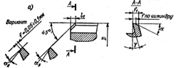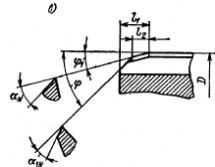 Первый создание режущей части с ломаной режущей кромкой (рис.1. в), имеющей на части длины l1 - l2 угол в плане j = 45°, а на участке длиной l2 = 1-3 мм, прилегающем к калибрующей части, - угол в плане (j1 = 1-3°. Такая форма режущей части позволяет основную часть припуска снимать с достаточно большой толщиной среза, а оставшуюся часть припуска обрабатывать с малой толщиной среза. Для повышения качества обработки рекомендуется переходный участок от режущей части к калибрующей закруглять.