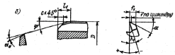 Развертки с углом в плане меньшим 45° обычно имеют дополнительную фаску с X 45° (рис.1, б) для облегчения направления развертки при ее введении в обрабатываемое отверстие. Для повышения качества обработанной поверхности целесообразно уменьшать угол в плане j,. При этом режущая часть удлиняется, сокращается запас на переточку разверток, одновременно снижается осевое усилие. Для ручных разверток последнее обстоятельство играет наиболее важную роль, поэтому ручные развертки выпускают с малыми углами в плане (j = 1-2°).