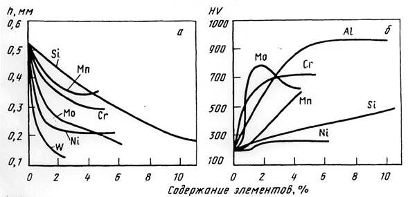 Легирующие элементы существенно влияют на глубину азотированного слоя h и поверхностную твердость (рисунок 3.6).