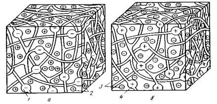 Ионообменными свойствами обладают очень многие природные и искусственные соединения. Синтетические смолы имеют большее практическое значение. Макромолекула ионообменных смол состоит из полимерных молекул, углеводородные цепи которых имеют поперечные связи - мостики, образующие матрицу смолы. Матрица несет в себе неподвижные заряженные группы - фиксированные ионы, заряд которых нейтрализуется внутри смолы подвижными ионами противоположного знака, которые называются противоионами. В целом фиксированные ионы и противоионы образуют ионогенные группы рис….