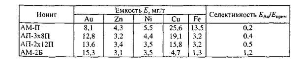 В табл. 3.2 приведены значения равновесных обменных емкостей и селективности анионитов различных типов. Селективность оценивалась как отношение емкости смолы по золоту к суммарной емкости по металлам - примесям.