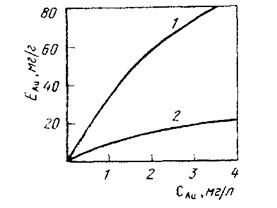 Рис. 3.3. Изотерма сорбции золота анионитом АМ-2Б из чистого (1) и технологического растворов (2)