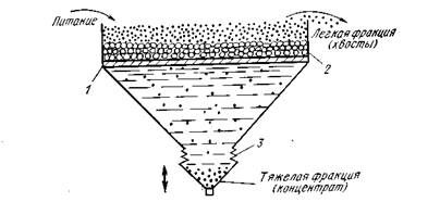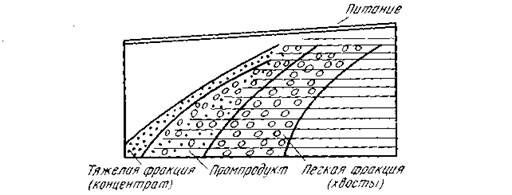 Измельченная руда (рис….) в виде пульпы подается на решето 1 отсадочной машины. При обогащении мелкого материала на решето предварительно укладывают слой искусственной постели 2 из другого материала. Плотность материала искусственной постели должна быть меньше плотности тяжелого минерала разделяемой смеси и больше плотности легкого. При обогащении золотых руд в качестве постели обычно используют металлическую дробь или гематитовую руду. Крупность частиц постели принимается в 3-6 раз больше максимальной крупности частиц обогащаемого материала. Пульпа исходного материала движется по постели вдоль решета. Под действием силы тяжести частицы твердого стремятся осесть на постель, но скорость осаждения у них различна. У тяжелых частиц она больше, чем у легких. При восходящем потоке воды частицы золота отстают от легких частиц пустой породы при движении их с водой вверх.