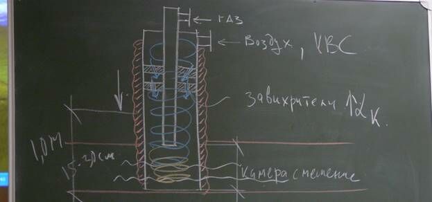 По внешней полости (трубе) подается окислитель. По внутренней - подается топливо. Между тубами, для окислителя установлены завихрители (реакторы). Они закручивают поток воздуха во внешней межтрубной области. Это приводит к улучшению смешения окислителя с топливом в камере смешения (концевая часть фурмы). С другой стороы к увеличению коэффициента альфа К (конвективной теплоотдачи) от наружной трубы, что повышает эффективность ее охлаждения. Снижение температуры на трубе, из-за этого на ней образуется гарнисаж. Наконечник заглубляется в расплав на 20см. После сгорания 1м фурмы ее ремонтируют.