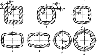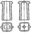 Поперечное сечение изложниц может быть квадратным, прямоугольным, круглым, многогранным (см. рисунок 17). Слитки квадратного сечения идут на сортовой прокат; слитки прямоугольного сечения при отношении их ширины b к толщине h менее 1,5 для получения как листа, так и сортового проката; плоские слитки при отношении b/h в пределах от 1,5 до 3,0 — для прокатки на лист. Слитки круглого сечения используют для изготовления труб, бандажей, колес. В многогранные изложницы отливают слитки для кузнечных поковок.