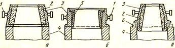 По форме продольного сечения изложницы бывают двух типов: с уширением кверху для разливки спокойной стали (см. рисунок 18, а) и с уширением книзу для разливки кипящей и полуспокойной стали (см. рисунок 18, б). Для разливки кипящей и полуспокойной стали иногда применяют изложницы бутылочной формы (см. рисунок 18, в), верхнее отверстие которых после наполнения изложницы сталью закрывают пробкой или крышкой. Быстрое застывание металла в суживающейся части бутылочной изложницы обеспечивает снижение химической неоднородности стали но сравнению с разливкой в обычные сквозные изложницы.