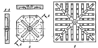 В поддонах для сифонной разливки (см. рисунок 20) делают углубление в центре и расходящиеся от пего открытые сверху каналы прямоугольного сечения для укладки сифонного кирпича. Если при разливке сверху применяют изложницы без дна, то в поддоне делают выемку, в которую укладывают сменный вкладыш из стали и иногда из огнеупорного кирпича, предотвращающий размывание поддона струей металла.
