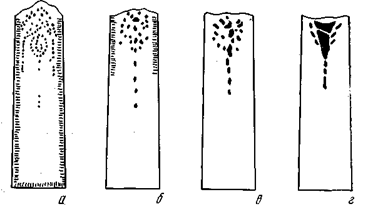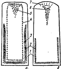 Механически закупоренный слиток кипящей стали характеризуется расположением газовых пузырей в определенном порядке. Структура механически закупоренного слитка кипящей стали, приведена на рисунке 22, а.