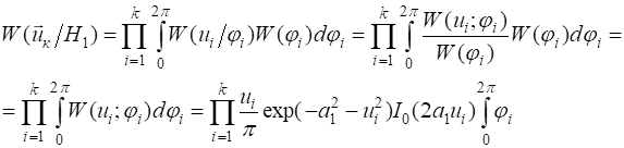 В случае “дружных” флуктуаций интеграл от многомерной (совместной) плотности огибающей  по распределению , как правило, в явном виде не вычисляется. Один из вариантов расчета отношения правдоподобия такого сигнала с помощью схемы обнаружения – оценивания мы рассмотрим несколько позже.