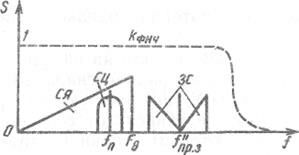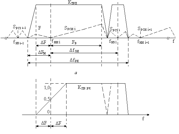 Радиосигнал (РС) вещательного телевидения представляет собой совокупность РСИ (изображения) и РСЗ (звукового сопровождения) одной ТВ программы. РСИ образуется в результате амплитудной модуляции сигнала несущей частоты изображения fни полным цветовым ТВ сигналом. Для сокращения полосы частот радиоканала нижняя боковая полоса спектра РСИ (Sрси) частично ограничена (рисунок 6.3, а) с помощью специального формирующего фильтра канала изображения ТВ радиопередатчика (его АЧХ обозначена Kтрп).