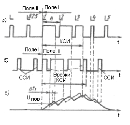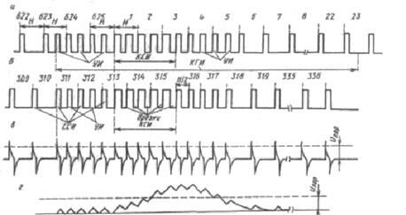 В системе отечественного телевидения принята такая форма СС, при которой отделение СС от сигнала яркости производится с помощью амплитудной селекции. Выделенный полный сигнал синхронизации (СС) в соседних полях показан на рисунках 6.10, а, б. Разделение ССИ и КСИ основано на различии их длительностей. Это позволяет использовать для разделения простые цепи: дифференцирующие – для выделения ССИ (рисунок 6.10, в), интегрирующие – для выделения КСИ (рисунок 6.10, г). Чтобы не прерывать передачу ССИ во время передачи КСИ, последние прорезаются импульсами двойной строчной частоты (импульсами врезки). Для того, чтобы выровнять условия выделения КСИ в четных и нечетных полях, до и перед КСИ вводится несколько уравнивающих импульсов (УИ) двойной строчной частоты.