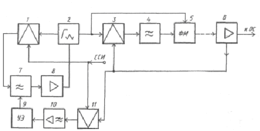 Сигнал ЗС после усилителя 11 поступает на вход синтезатора частоты 10, на выходе которого образуется частотно-модулированный сигнал с девиацией частоты Δfm = 50 кГц и средней частотой fпрз = fпр и – 6,5 МГц. Этот сигнал подается на вход повышающего смесителя частоты 12, на выходе которого после фильтрации и усиления в блоке 13 получаем ЧМ сигнал с несущей частотой fнз. j = fни. j + 6,5 МГц. Сформированные таким образом РСИ и РСЗ усиливаются в выходных каскадах 16 и 20 и складываются в пассивном раз- делительном фильтре 17, затем с помощью мостовой схемы 21 производится сложение с сигналами от второго полукомплекта. Далее сигнал через фидер поступает в передающую антенну 22.