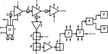 Кроме того, они осуществляют ответвление сигналов и подачу их в субмагистральные линии, содержащие участки кабеля 4, широкополосные усилители 5 и разветвительные устройства 6. В ряде случаев кабель 4 и усилитель 5 могут совпадать по параметрам соответственно с кабелем 2 и усилителем 3. Разветвительные устройства выполняются на базе направленных ответвителей.