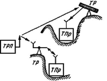 Радиорелейные линии (РРЛ). Здесь используются цепочки из приемно-передающих устройств двустороннего действия, что обеспечивает передачу частотно-модулированных радиосигналов в диапазонах УВЧ и СВЧ на большие расстояния. Комплексное использование РРЛ по передаче различной информации обеспечивается путем создания нескольких высокочастотных каналов-стволов, а также аппаратурой уплотнения (АУ) и выделения (АВ) сигналов. Эти сигналы могут подаваться потребителям, в частности ТЦ или ТРП, как с оконечных, так и с промежуточных станций.